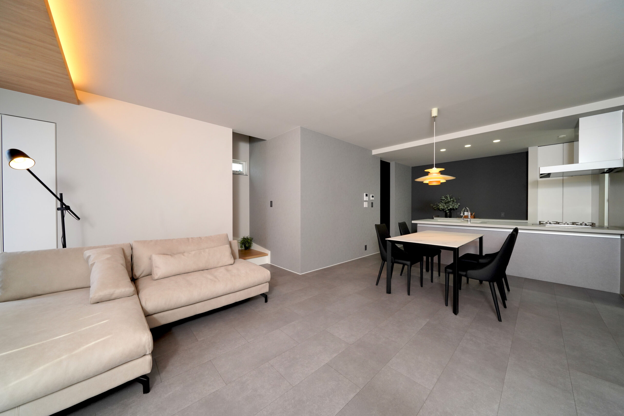 - シックな色味で統一したクールモダン空間。家具が合わせやすく一体感のあるリビング。
