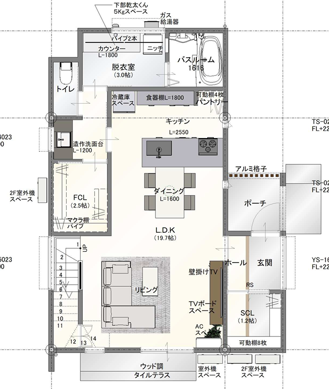 - 収納力たっぷりでキッチン周りがスッキリ。対面式で会話を楽しみながら家事ができる。
